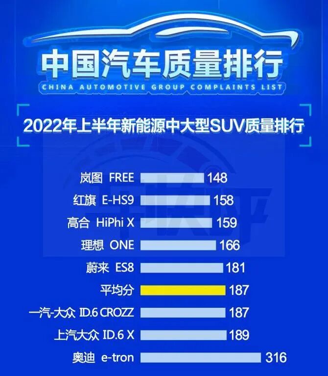 前不久,中国汽车质量网就发布了2022年上半年新能源中大型SUV质量排名。