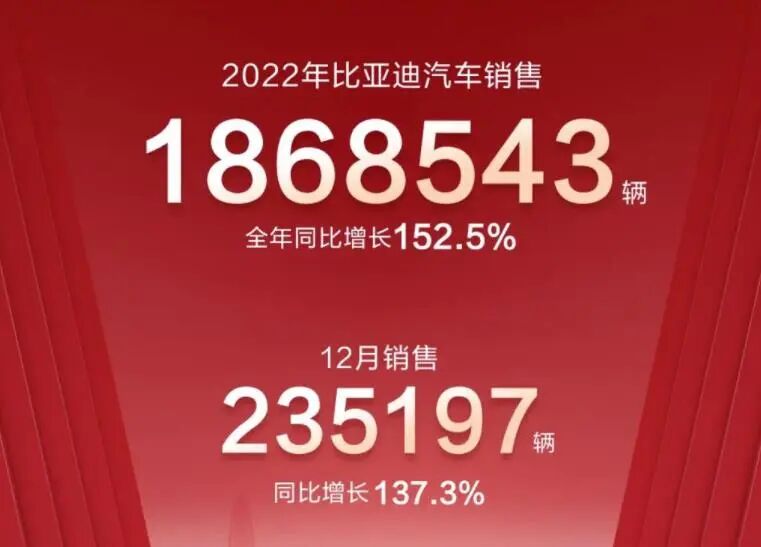 在整个2022年,比亚迪全年累计销量达到了186.9万辆,同比增长152.5%。