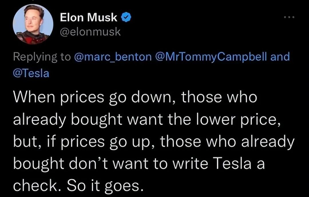 看到这么多人“声讨”特斯拉,马斯克终于做出回应了。他在社交平台发文表示:特斯拉价格下跌时,已经购买的人想要更低的价格。但是如果特斯拉上涨,已经购买的人不想给特斯拉开(补价)支票吧。