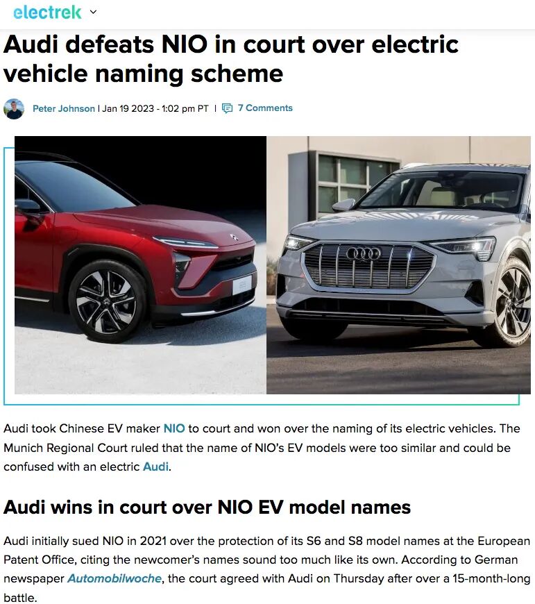 1月19日,关于奥迪起诉蔚来车名商标侵权一案,初审结果公布。德国慕尼黑地方法院认为,蔚来的车型命名侵犯了奥迪的商标权,判奥迪胜诉。