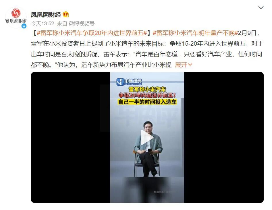 2月9日,在小米投资日上,小米创始人雷军又立下了一个大目标:小米造车争取15~20年内,进入世界前五。