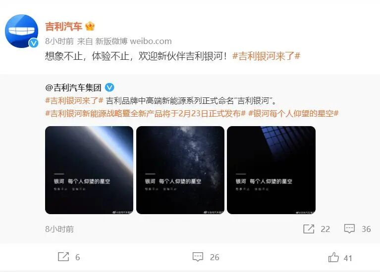 2月16日,吉利官宣旗下中高端新能源系列将会正式命名为吉利银河。2月23日,在杭州亚运馆主会场吉利银河新能源战略发布和全新的产品,将会全球首发。