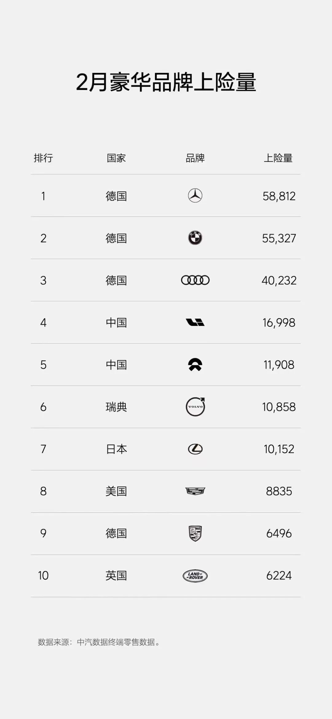 那么问题来了,超越德系BBA,蔚来和理想还有多少差距?从2月国内豪华汽车品牌上险量,就这个问题我们做一下分析。