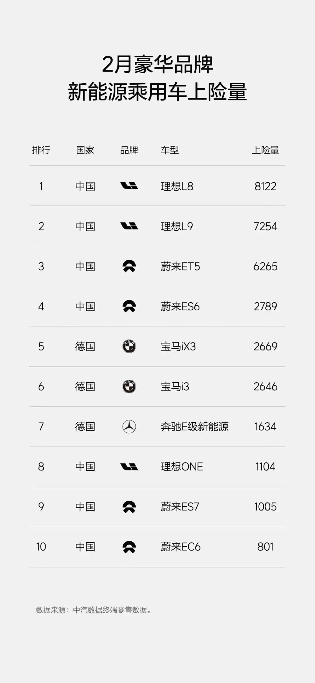 再来看一下中汽数据中心公布的2月豪华新能源车上限量数据,排在前4名的车型分别是理想L8、理想L9、蔚来ET5和蔚来ES6。