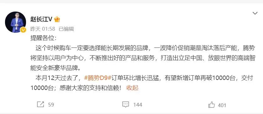 近日,腾势营销事业部总经理赵长江在社交平台发布了一条动态,在网上又引起了不小的轰动。