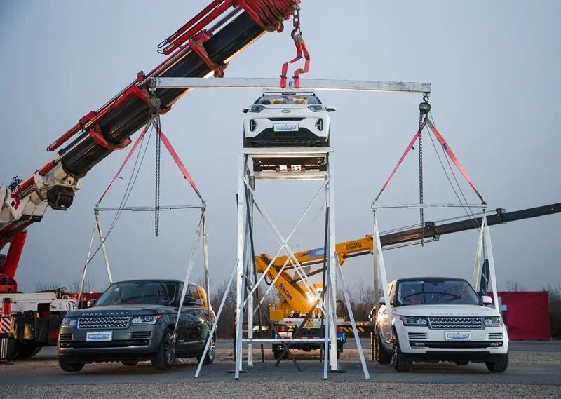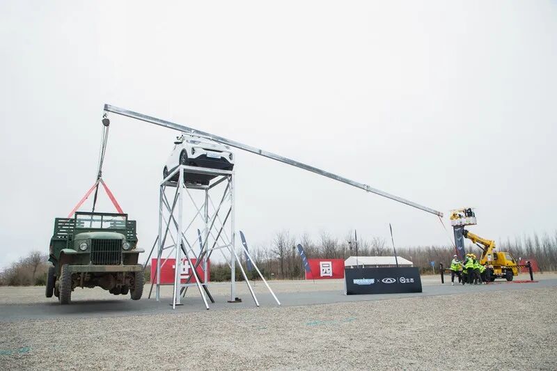 第二项是等力杠杆测试,以奇瑞小蚂蚁车身为支点,杠杆两侧各悬挂一辆车重近2.5吨的路虎揽胜行政版,奇瑞小蚂蚁再次完成了挑战。