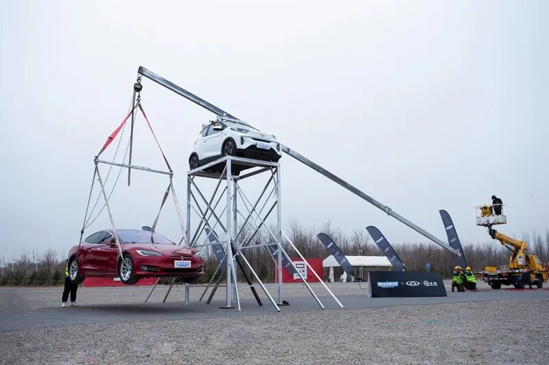 在挑战中,先是利用了“阿基米德”的省力杠杆原理,以奇瑞小蚂蚁车身作为支点,分别翘起了车身自重为2.1吨的特斯拉Model S和重达5吨的GMC CCKW 535大卡车。