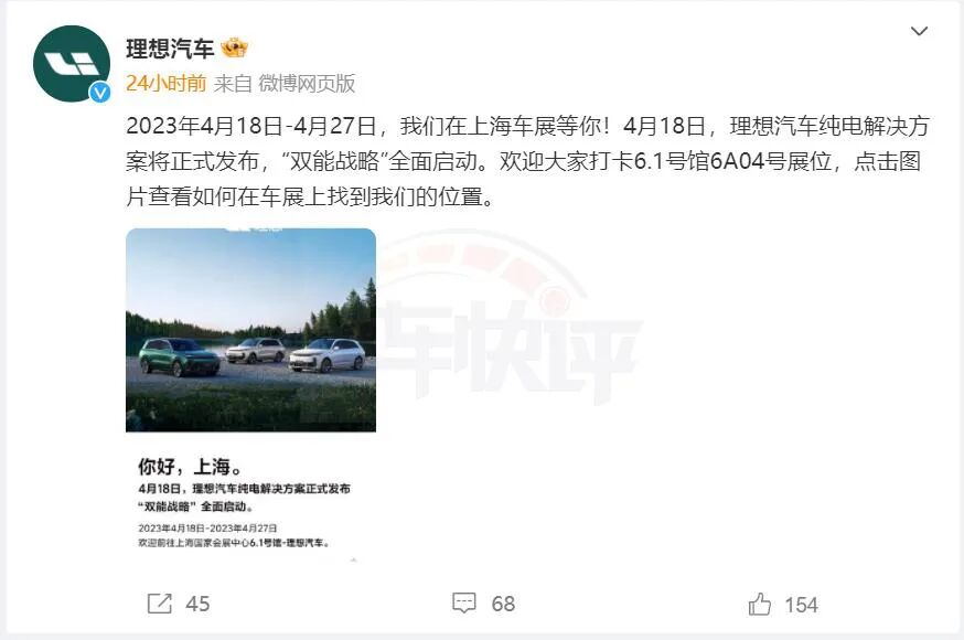 4月7日理想汽车官方发布消息称,4月18日上海车展上将会正式发布纯电解决方案,“双能战略”全面启动。