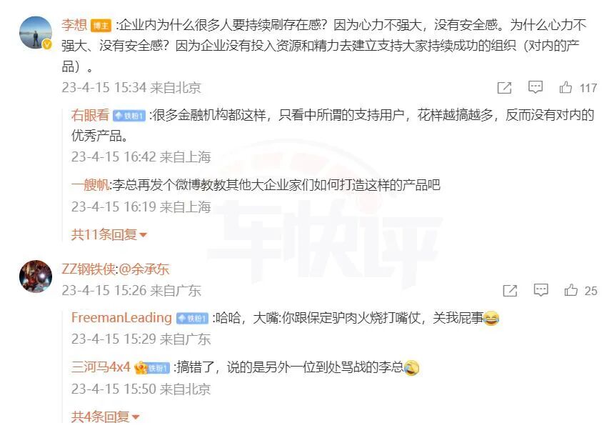 李想在社交平台上这样说:企业内为什么很多人要持续刷存在感?因为心力不强大,没有安全感。