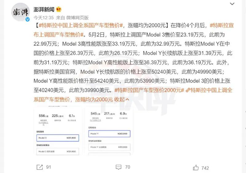 5月2日特斯拉对旗下在售车型进行调价,上涨了2000元。价格上调,Model 3后轮驱动版车型售价上涨至23.19万元,高性能版车型上涨至33.19万元。
