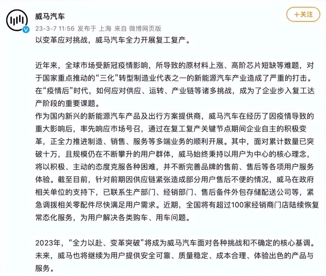 好在几天后的3月8日,威马汽车官方发布消息称已经复工复产,全国超100家经销商门店也将会恢复常态化服务。
