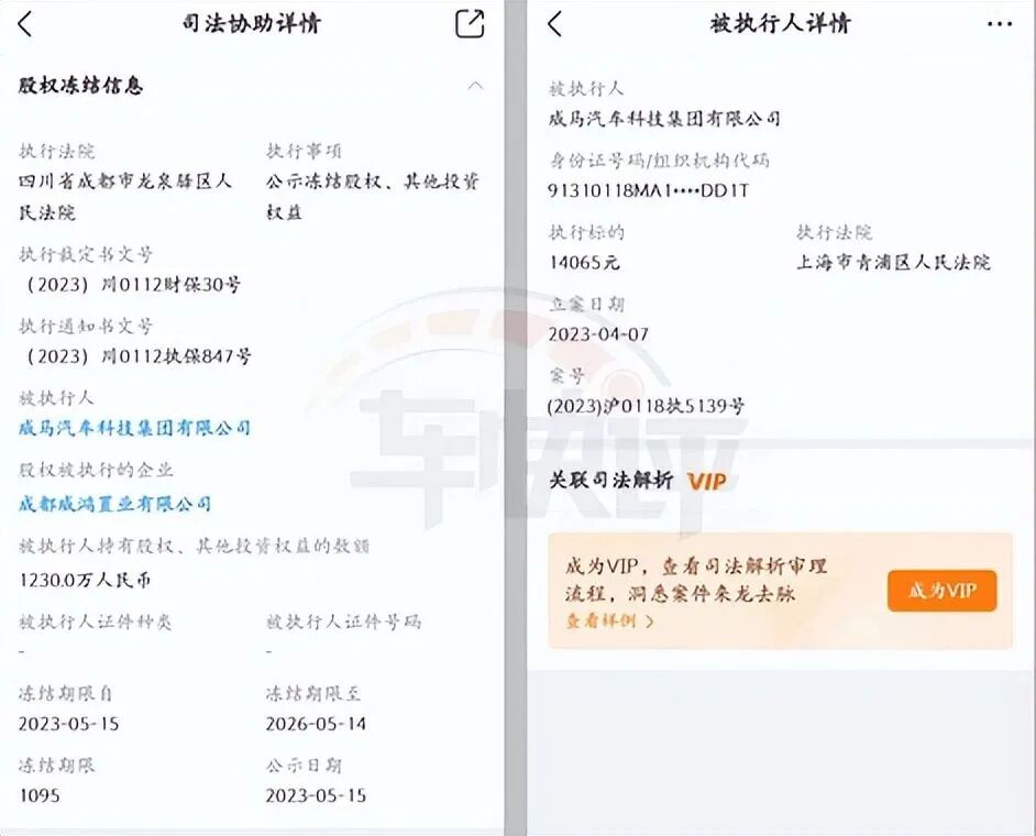 公开资料显示,5月15日成都威鸿置业有限公司1230万人民币股权被冻结,被执行人是威马汽车科技集团有限公司。