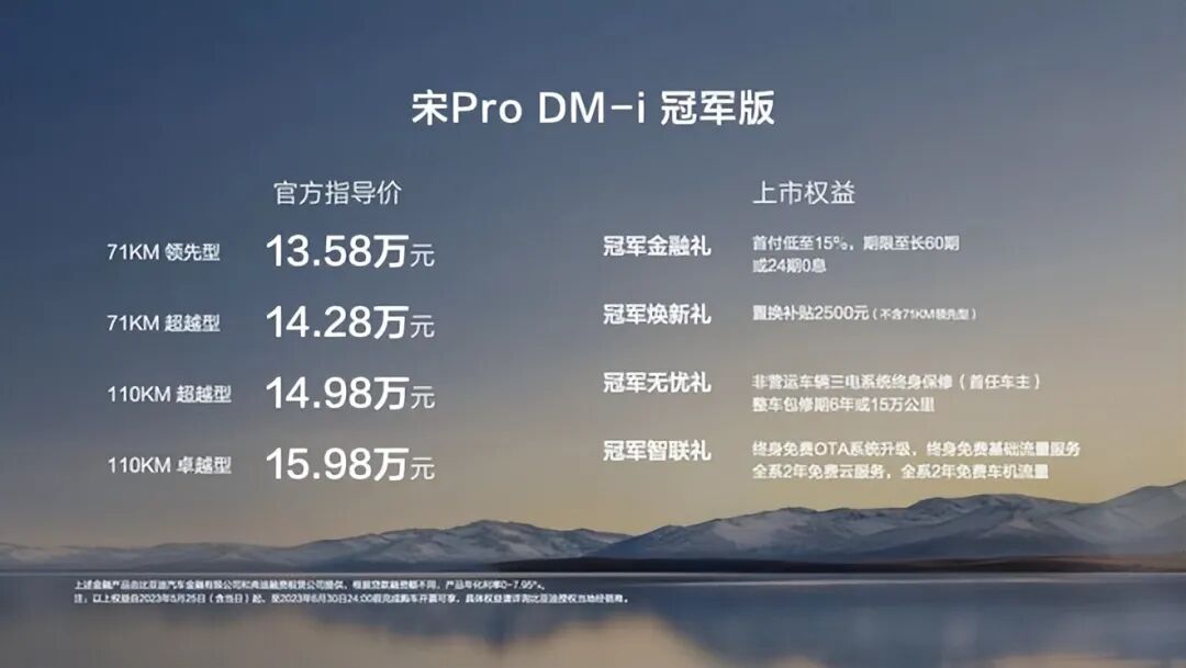 2023年随着比亚迪一系列冠军版车型的上市,5月25日宋Pro DM-i冠军版车型正式上市。新车共推出四款车型,售价区间为13.58~15.98万元。