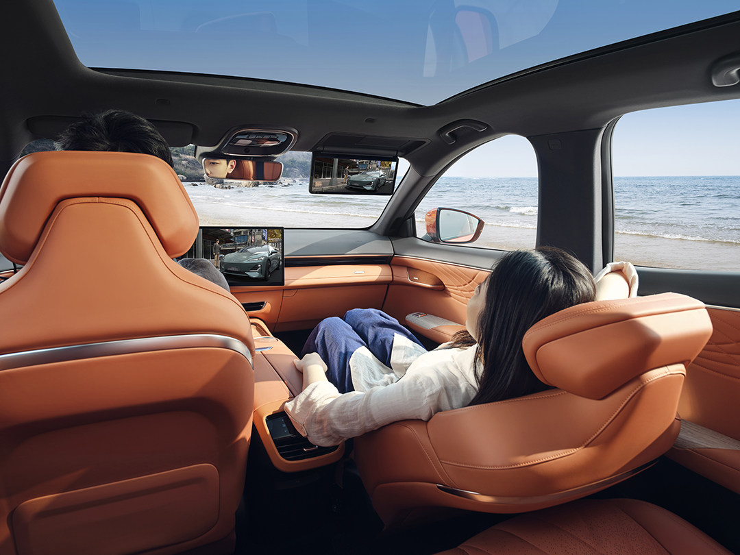 12.3英寸的副驾娱乐屏,并没有像其他新能源车那样在中控台上,而是别出心裁的设计在了副驾驶遮阳板的位置。这样的话放平副驾驶座椅后,因为角度相对比较高,所以用副驾娱乐屏看视频更方便。