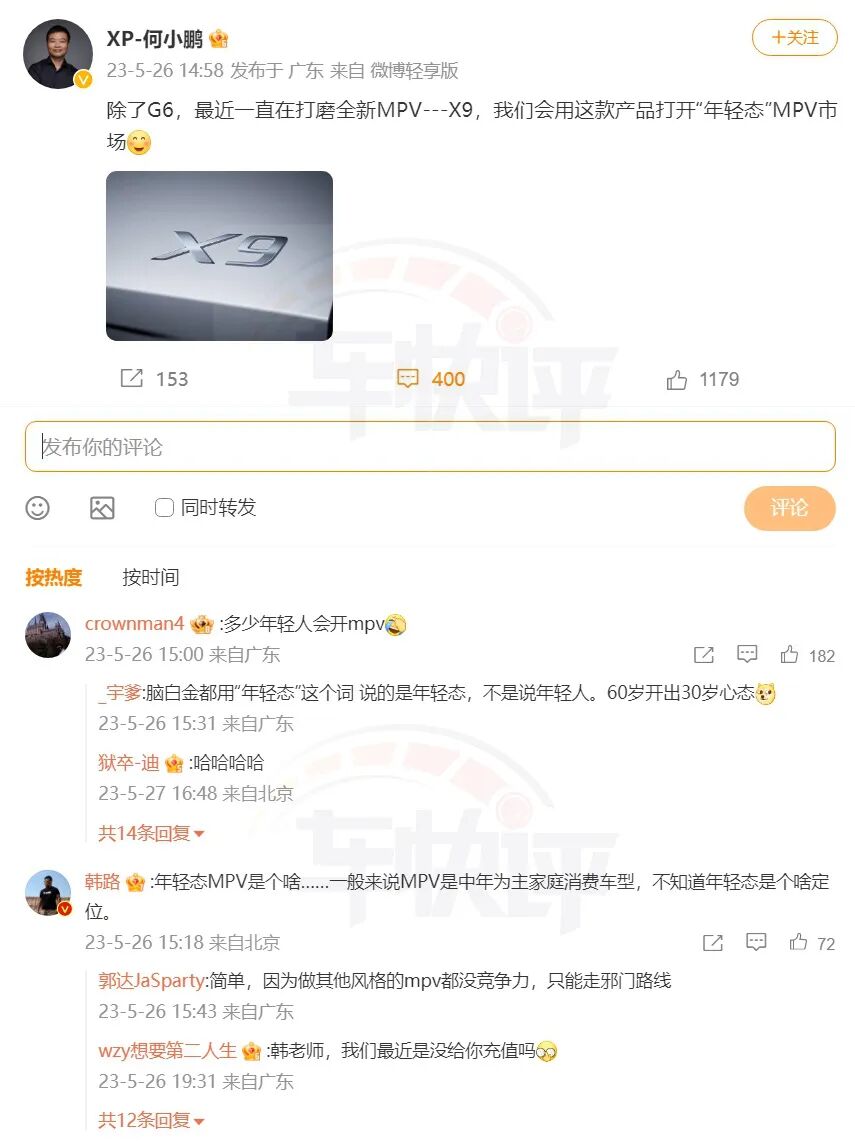 小鹏汽车董事长何小鹏5月26日在社交平台表示,小鹏最近一直在打磨全新的MPV——X9,将会用这款产品打开“年轻态” MPV市场。