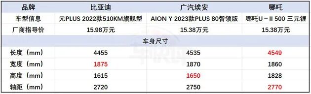 那么接下来,我们就以15万元左右的预算,分别选出官方指导价为15.98万元的元PLUS 510km旗舰型、官方指导价为15.38万元的埃安AION Y Plus 80智领版和官方指导价同为15.38万元的哪吒U-II 500三元锂三款车型,来做一下对比。