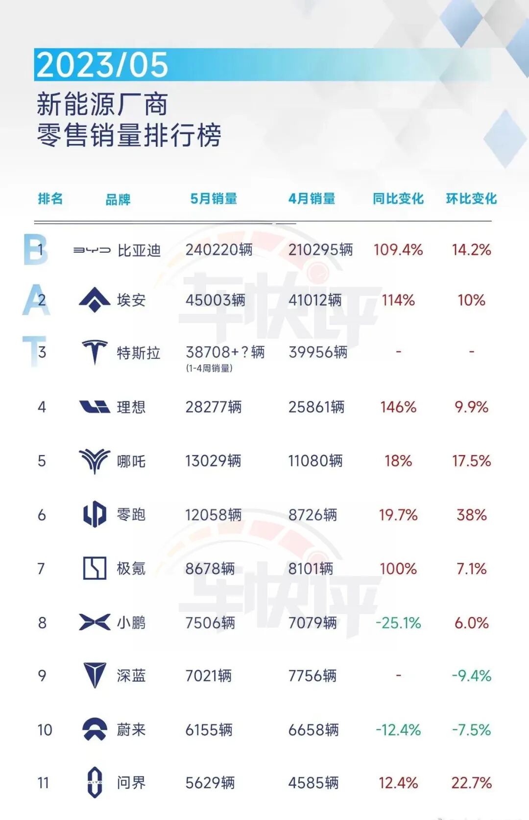 与此同时,国内新能源车企又形成了“BAT”的格局。所谓的“BAT”,就是比亚迪、埃安和特斯拉。