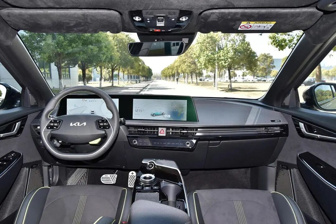 和外观一样,起亚EV6内饰的设计并没有像大多数纯电动车那样看上去非常简洁,仍然能看到传统燃油车的影子。据说内饰的用料,采用的是再生塑料。配备有双12英寸的曲面双面屏和双辐式方向盘,在中控屏下方是用来控制空调的触控按键。