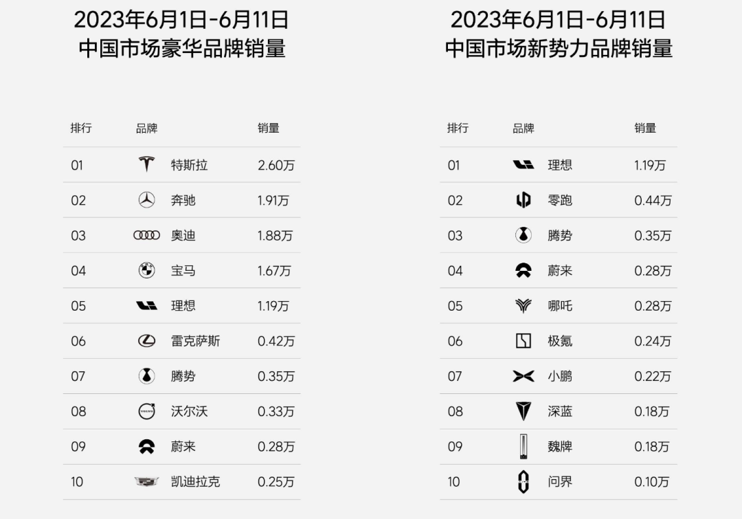 根据最新发布的销量数据显示,6月1日到6月11日国内豪华汽车品牌销量,排在第一的是特斯拉,销量为2.6万辆。紧接着是德系豪华品牌奔驰、奥迪和宝马,奔驰和奥迪销量分别是1.91万辆和1.88万辆,宝马销量为1.67万辆。