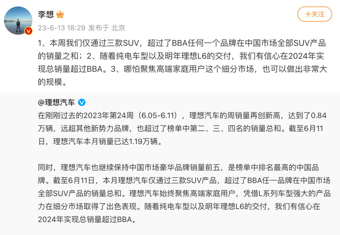 作为理想汽车的创始人,李想看到理想汽车的这个市场表现,我想内心一定是欣喜若狂的。于是便在6月13日在社交平台发文,称理想汽车通过三款SUV,超越了BBA任何一个品牌在中国市场全部SUV产品的销量之和。