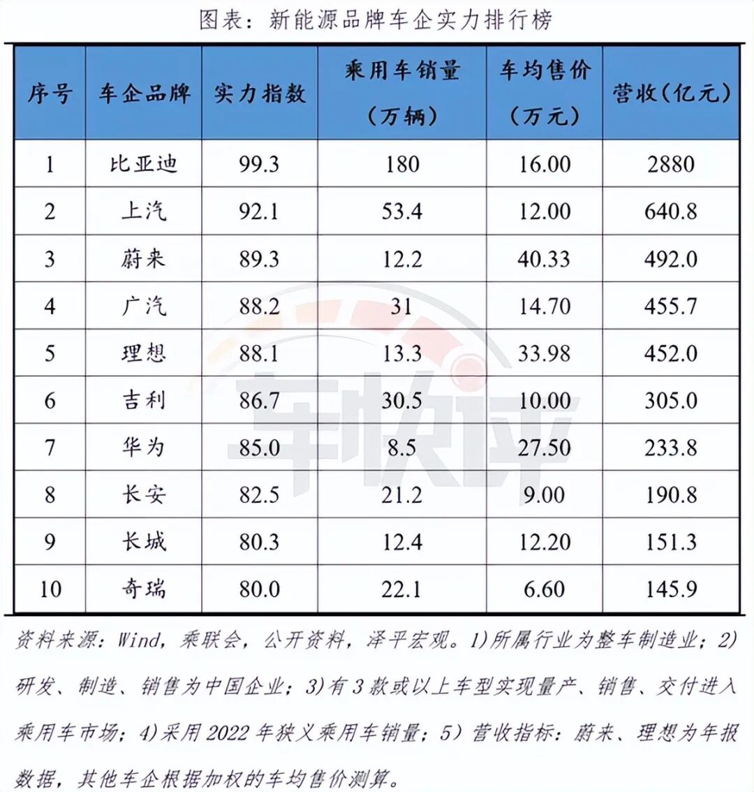 而造车新势力蔚来和理想两家车企,实力指数分别是89.3和88.1,跟比亚迪还存在一定的差距。