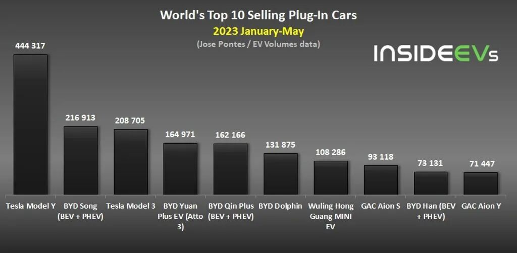 第4到第6名,全部被比亚迪所包揽,是比亚迪的宋PLUS、元PLUS和比亚迪海豚。这三款车型5月全球的总销量分别为38056辆、32608辆和30679辆。