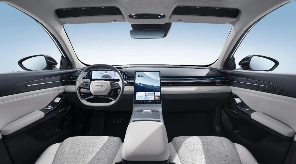 内饰的设计上,新车和银河L7虽然也采用了比较类似的风格,配备有四幅式多功能方向盘、10.25英寸全液晶仪表盘和竖式设计的13.2英寸中控大屏。从图片中来看,新车并未配备副驾娱乐屏。中控屏的设计,也不像银河L7那样,偏向驾驶员一侧。