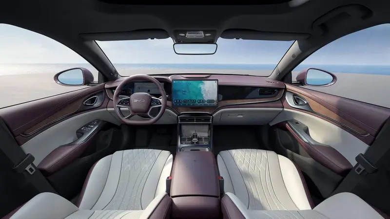 从目前比亚迪官方所公布的内饰图来看,海豹DM-i与海豹纯电版车型在设计上也略有不同。最明显的区别主要体现在方向盘的设计风格和空调出风口两个地方。新车配备了15.6英寸的可旋转中控大屏、10.25英寸的全液晶仪表盘和HUD抬头显示屏。