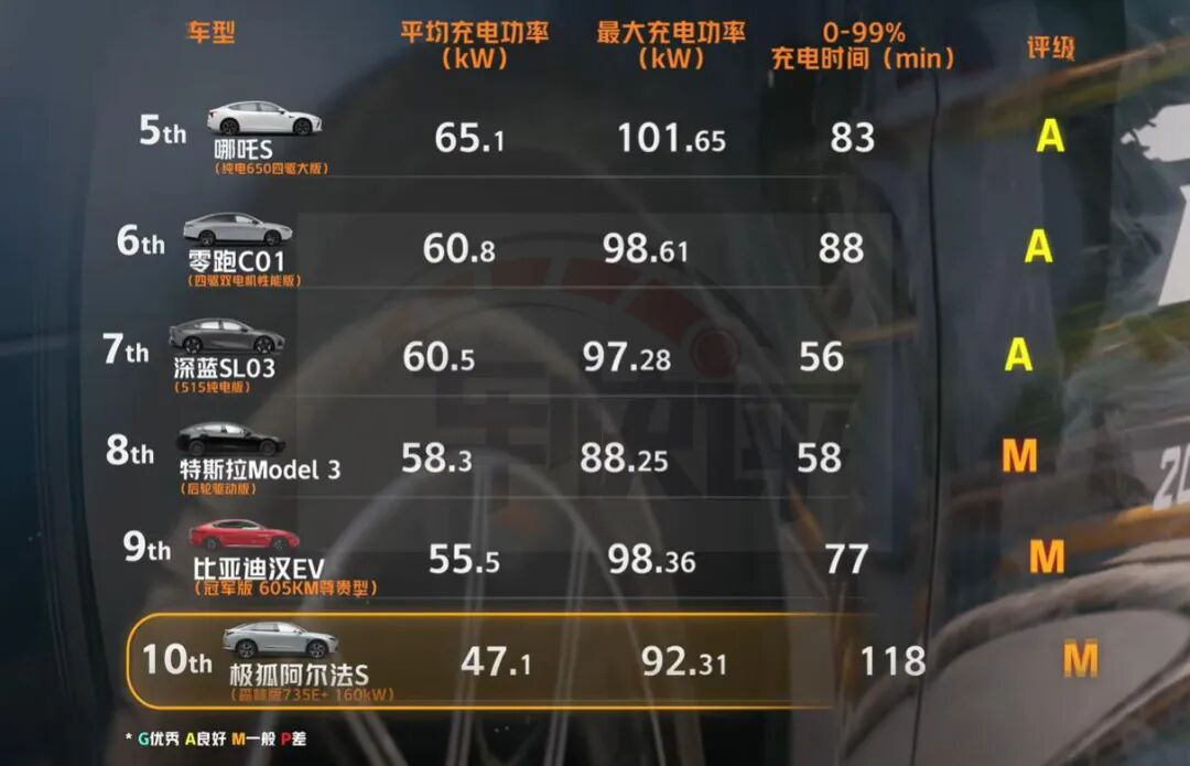 其次是充电测试,表现比较好的车型分别是小鹏G9 2022款 650是性能版Max,最大充电功率118.43kW,平均充电功率92.5kW;路特斯Eletre 2022款S+,最大充电功率118.38kW,平均充电功率80.3kW;阿维塔11 2023款超长续航单电机版4座,最大充电功率118.2kW,平均充电功率99.1kW;比亚迪海豹 2023款650KM 冠军版四驱性能版,最大充电功率为118.39kW,平均充电功率70kW;极氪009 2023款WE版,最大充电功率107.62kW,平均充电功率65.5kW;岚图追光2023款 580km标准续航版,最大充电功率100.8kW,平均充电功率61.8kW。