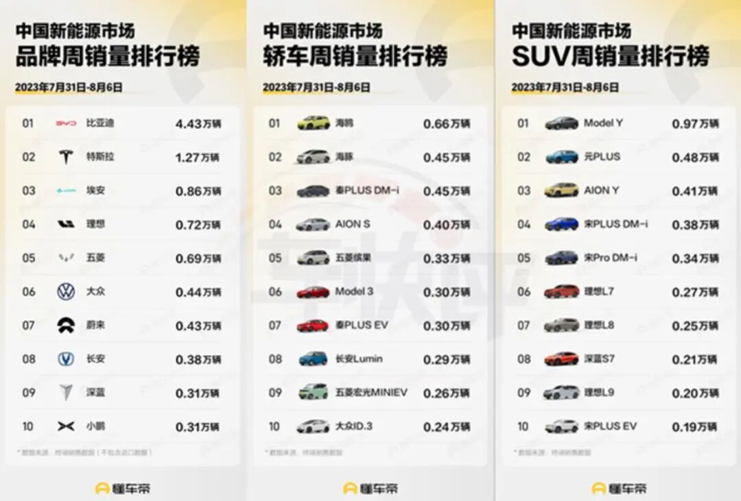品牌方面,销量排在前三的分别是比亚迪、特斯拉和埃安。其中比亚迪销量4.43万辆,特斯拉销量1.27万辆。比亚迪和特斯拉也是8月第1周新能源车企中,唯二的两家销量过万的车企。