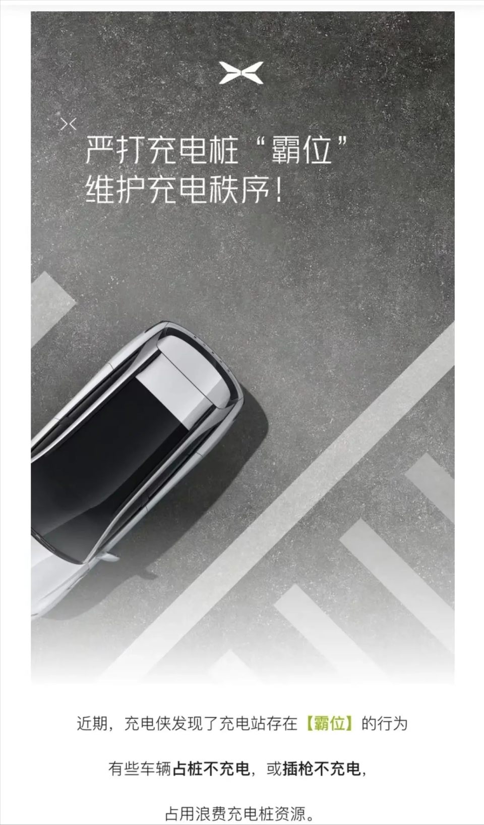 鉴于此,8月8日小鹏汽车官方发布了一则公告,内容是严打充电桩“霸位”,维护充电秩序。
