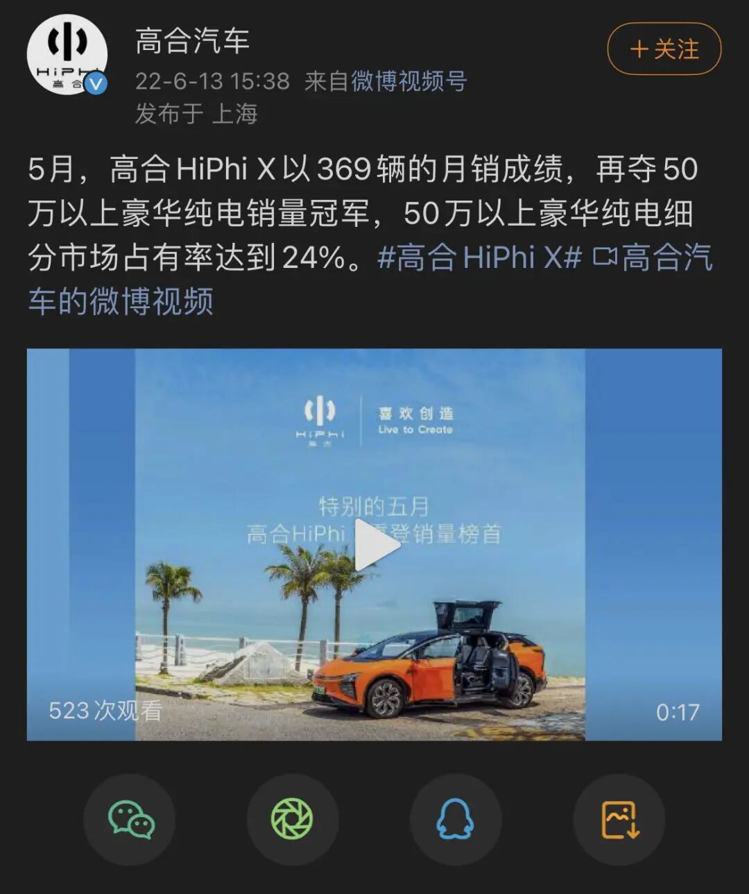 6月13日,高合汽车官方发布消息称,5月高合HiPhi X以369辆的月销成绩,再夺50万以上豪华纯电销量冠军。
