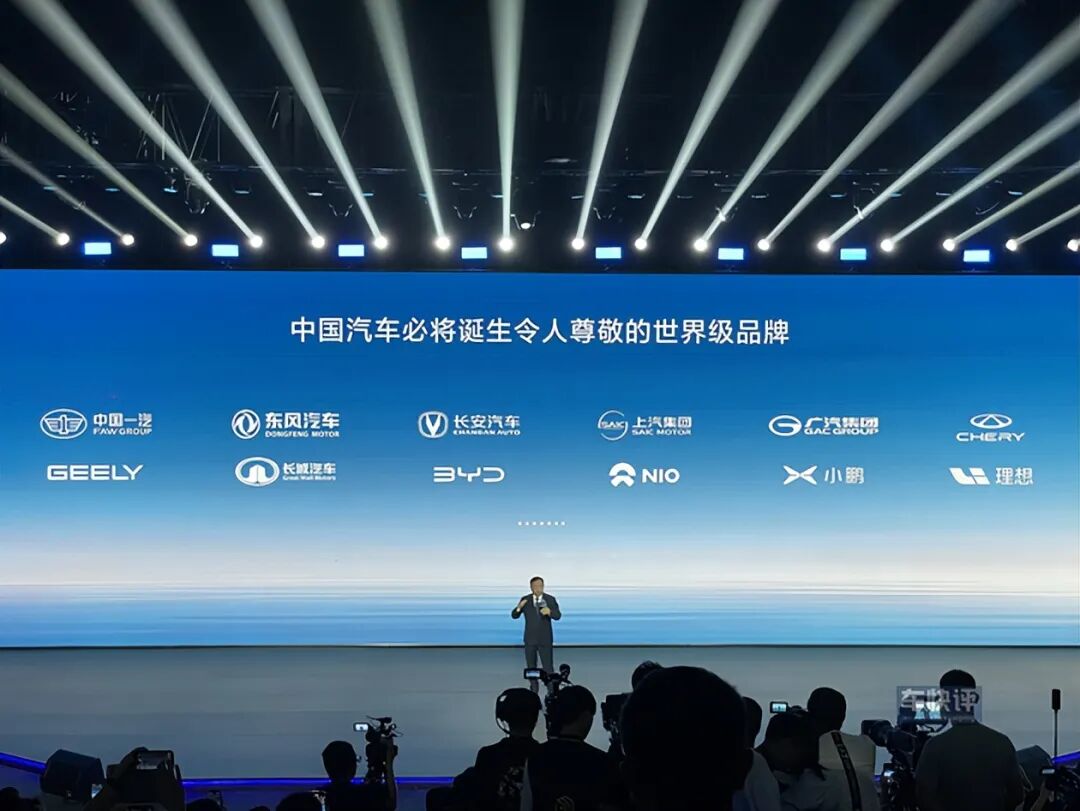 放在C位的是红旗的E-HS9,比亚迪很谦虚的将自家的两款车汉EV和海豹DM-i放在了并不显眼的位置。在车辆后方有一个大的围挡,上面写着“在一起才是中国汽车”7个大字。