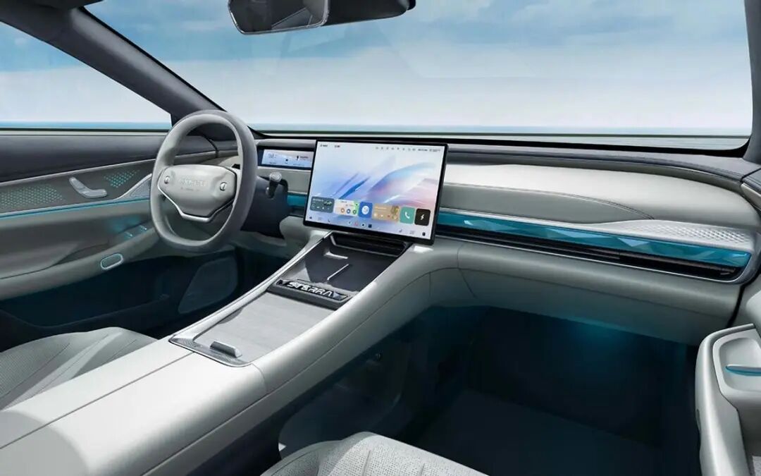尽管新车的内饰部分官方暂未公布,但是从之前发布的图片来看新车的内饰和很多新能源车一样,主打的是简洁和科技感,中控台有氛围灯和水晶面板装饰。配备有15.6英寸悬浮式中控屏和内嵌式的液晶仪表盘,还会配备HUD抬头显示屏。方向盘则使用的是双辐式平底设计。除了左右两侧各有一个波轮,没有多余的触控按键。