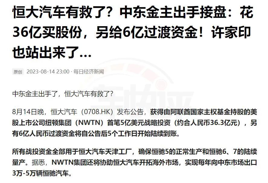 官方发布的公告显示,恒大汽车获得来自中东地区的纽顿集团5亿美元的战略投资。除了这5亿元的战略投资,纽顿集团还将为恒大汽车提供6亿元人民币的过渡资金。