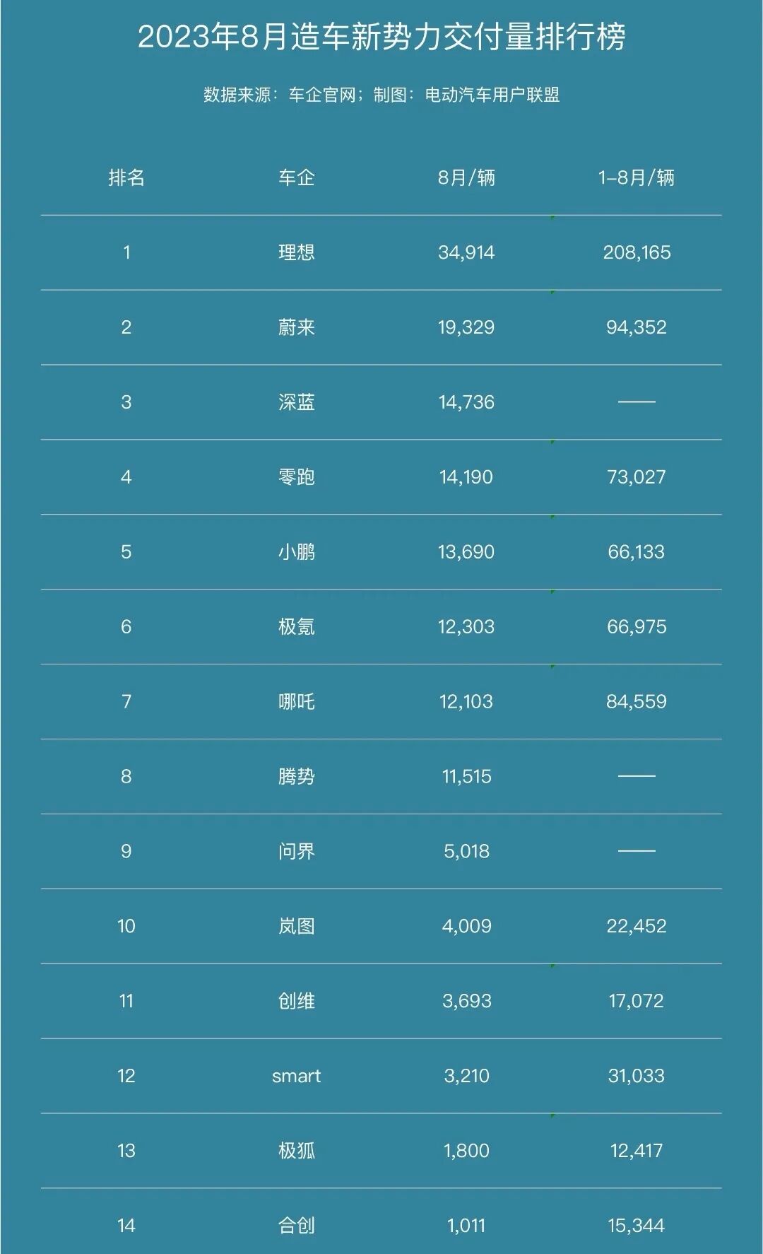 极氪、哪吒和腾势三家车企,分别位居销量榜的第6~8名,月销都在万辆以上。AITO问界8月销量5018辆,位居第9名。