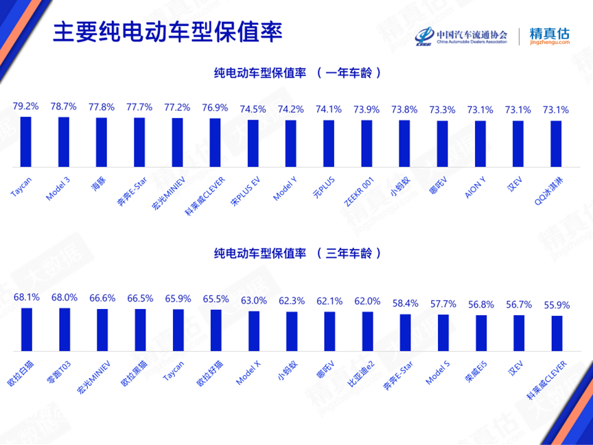 保时捷Taycan三年车龄的保值率就远不如一年车龄保值率那么高了,只排在了第5名。冠军车型是已经停产的欧拉白猫,零跑T03超越了宏光MINI EV一跃成为第2名。