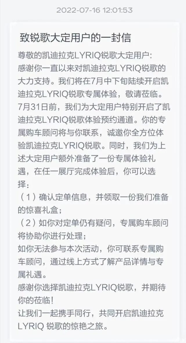关于此事,7月16日凯迪拉克官方在其APP上发表了一封致用户信。