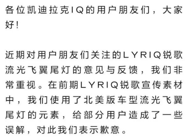 凯迪拉克官方表示,宣传素材中使用的是北美车型的流光飞翼尾灯元素。国产版锐歌流光飞翼尾灯不存在减配,部分功能呈现方式与北美版车型有所不同的原因,是国产版车型必须符合国家标准。