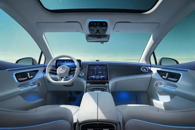 新车在内饰的设计上,也与奔驰EQS比较接近,配备有12.8英寸的中控大屏、12.3英寸全液晶仪表盘以及三幅式多功能方向盘。