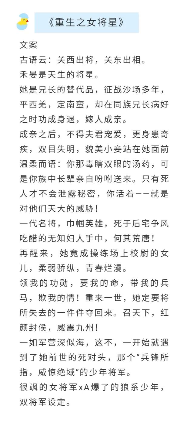 1.《重生之女将星》by千山茶客