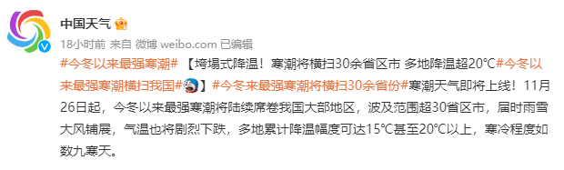 据中国天气报道,26日起(也就是明天),全国大部地区都将迎来今冬以来最强寒潮,寒冷程度如数九寒天。