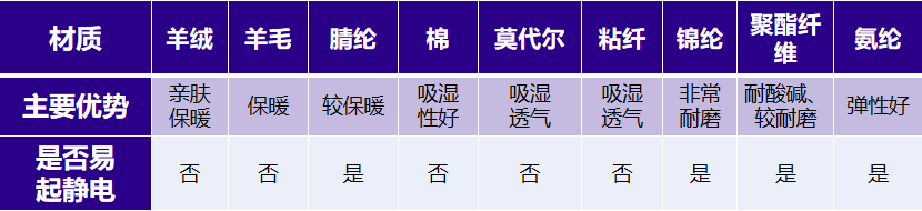 老人、皮肤干燥、怕静电的人:选羊绒、羊毛、棉、莫代尔、粘纤材质。