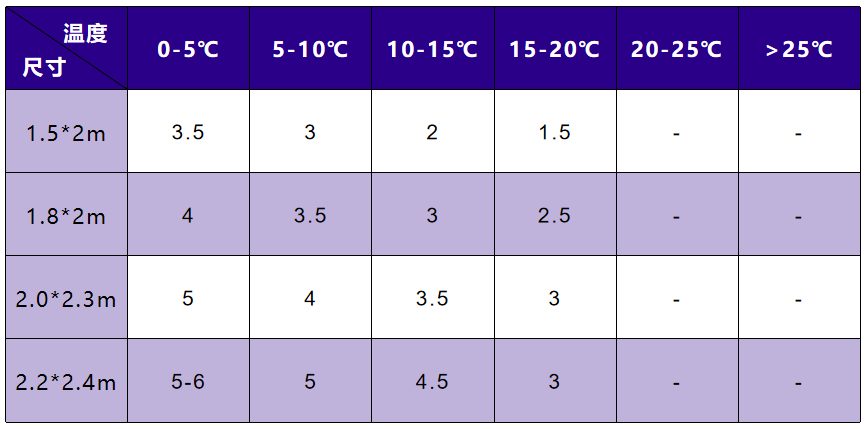 不同地区可以根据当地的气温需求,对照以下表格购买对应羽绒填充量的羽绒被。