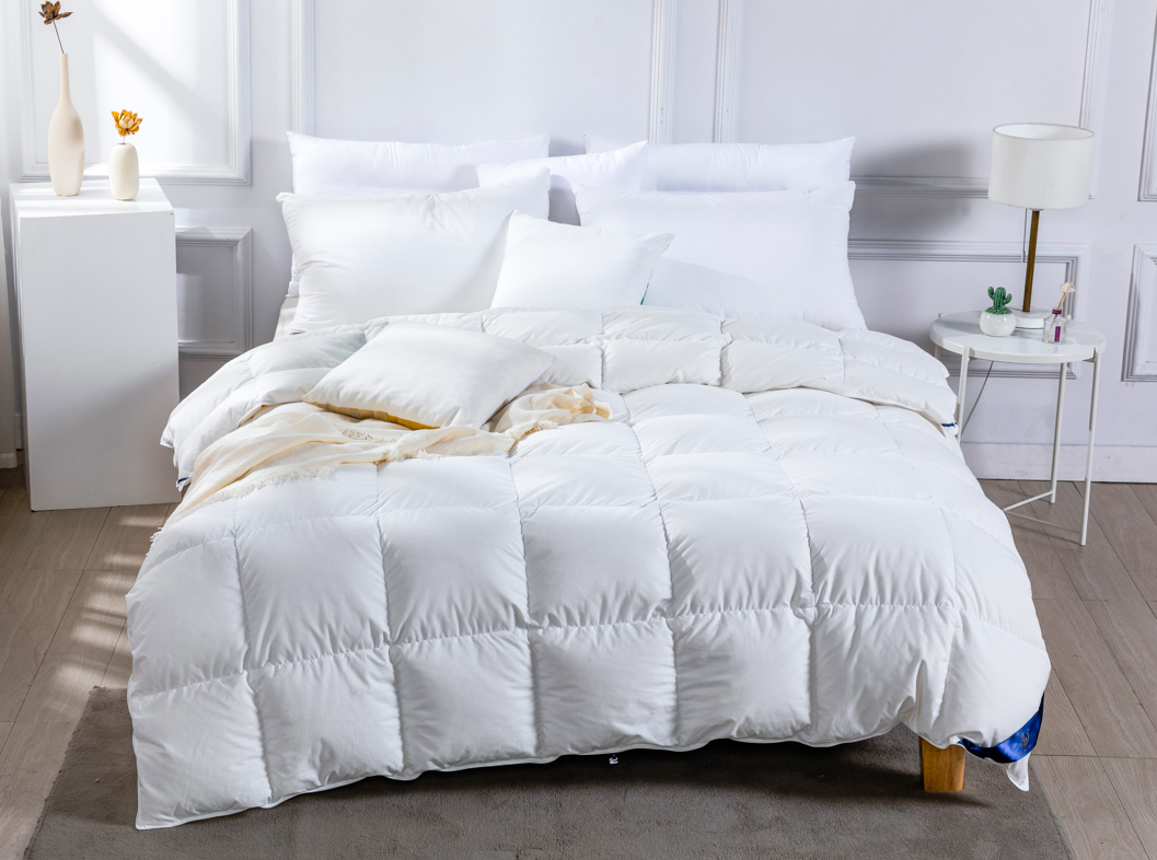 绒子含量用百分比表示。市场常见的有70%绒、80%绒、85%绒、90%绒、95%绒。低于50%的不能称之为羽绒被。高品质羽绒被,绒子含量应为90%以上。