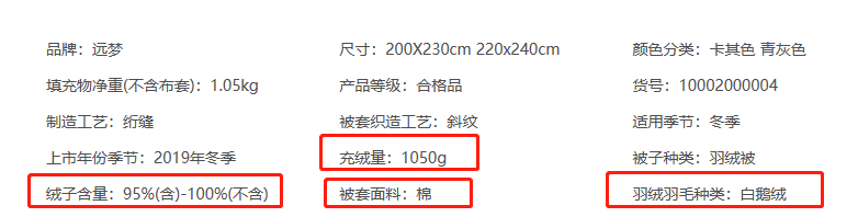 网购看不到实物、无法检验面料触感与舒适度,但我们可以根据网页展示的信息,来判别被子品质的优劣。一般来说,我们能从网站上了解到的信息有这几点:价格、羽绒羽毛种类、绒子含量、充绒量、被套面料等,所以我们可以通过看这几点信息来挑选羽绒被。