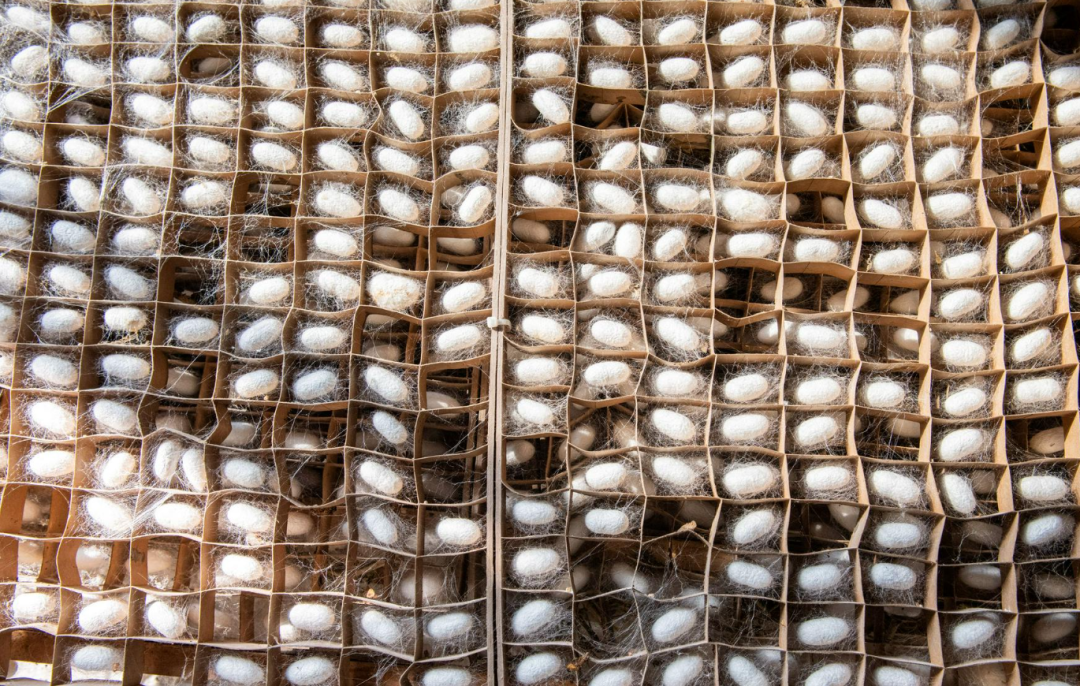 此外养蚕也是一个细致活,不仅需要种植照料桑树,还要采桑、清洗桑叶、定时喂蚕、定时清理粪便、桑叶残根、定期消毒等,如此操劳45天左右,桑蚕才会吐丝结茧,材质获取可谓是辛苦不易。而柞蚕丝生存于野外,养殖过程虽不需要付出心力,但因柞蚕丝活动区域比较分散,结茧后需要去野外找到它们吐丝之处,一个个收集,也并非一件易事。
