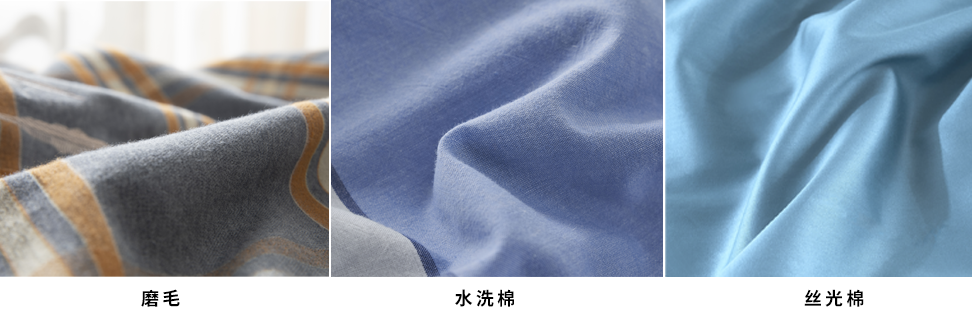 32支纱支较粗,面料比较厚实,所以磨毛面料多用32支等低纱支面料加工处理;水洗棉、双层纱等则多为40支;60支及以上的面料属于高支高密中高端棉,为增加面料的品质感,一般会用缎纹纺织,并用丝光工艺处理增加面料的光泽感。