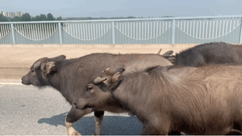 一群水牛在马路上逆行