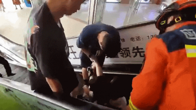 男孩的右脚不慎被扶梯卡住